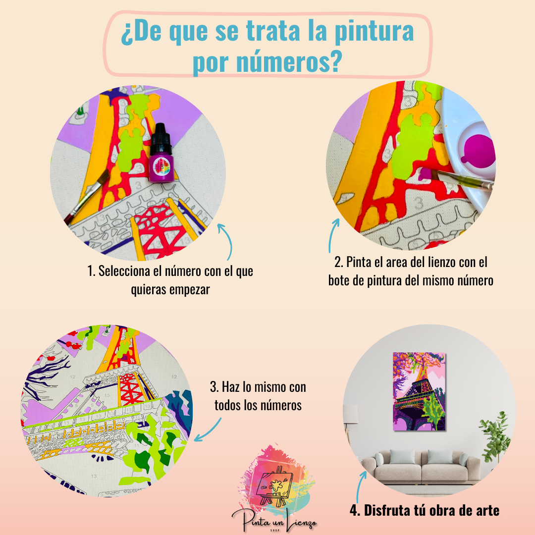 Es una técnica artística y relajante para pintar cuadros de forma fácil y divertida. En el lienzo de tu pintura encontrarás gran cantidad de subdivisiones con un número, estos números corresponden a un color específico, a medida que vayas completando el lienzo con los colores correspondientes a cada espacio empezarás a ver resultados increíbles hasta terminar y recrear con tus manos una verdadera obra de arte.